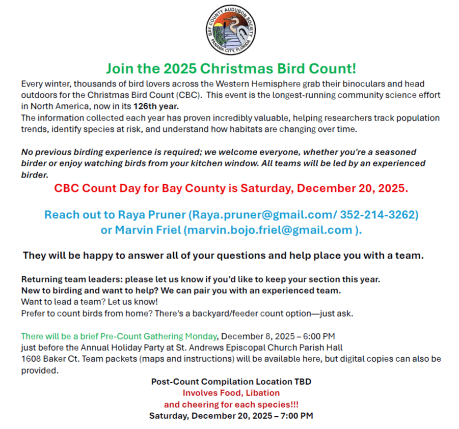 We are a local organization dedicated to the conservation and appreciation of birds and their habitats in the Bay County area. Through educational initiatives, birdwatching activities, and habitat preservation efforts, we actively engage the community in bird-related activities and environmental awareness.