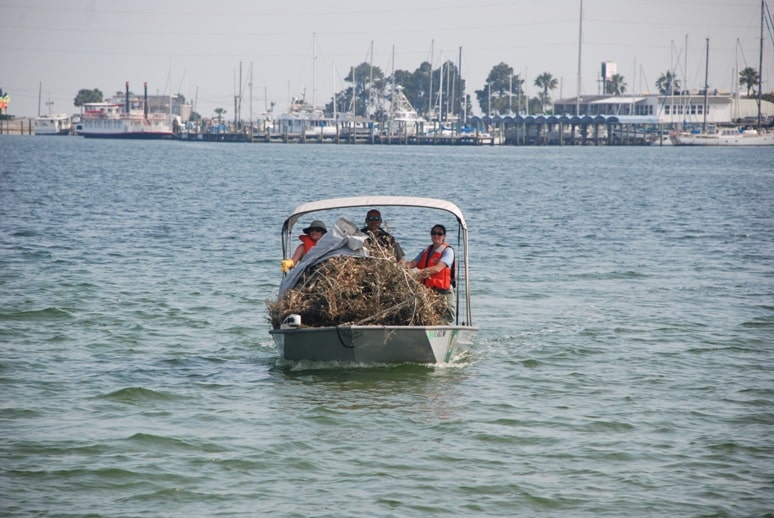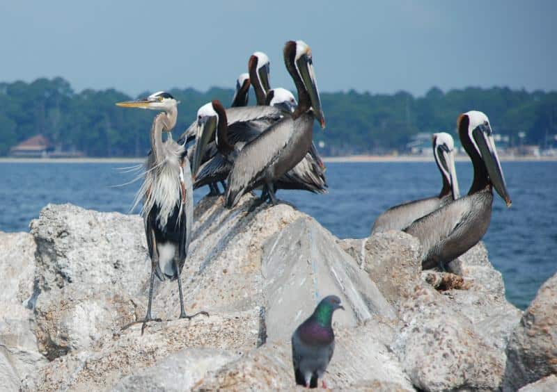 Our chapter has a long history of involvement with this small spoil island next to Port Panama City in St. Andrew Bay. The island is the only nesting place for brown pelicans in Bay County and it is a critical nest location for the entire western Panhandle. Besides the 300+ brown pelicans, several hundred laughing gulls, great blue herons, and a few other species nest on the island. Various storms over the past few years have washed away much of the vegetation on the island, so through the initiative of Dr. John Himes of the FL FWC, some volunteers hauled boatloads of tree branches out to the island for use by the brown pelicans to build nests among the rip-rap and jumbled concrete. The pelicans grabbed the branches even as they were being unloaded.