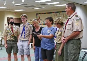 From left, Noah Vaden (Eagle Scout), Cole Mahler (Eagle Scout), Co-President Lynn Marcoux, Co-President Pam Overmyer, Cathy Vaden, John Mahler (Scoutmaster). 2022 Conservationist of the Year